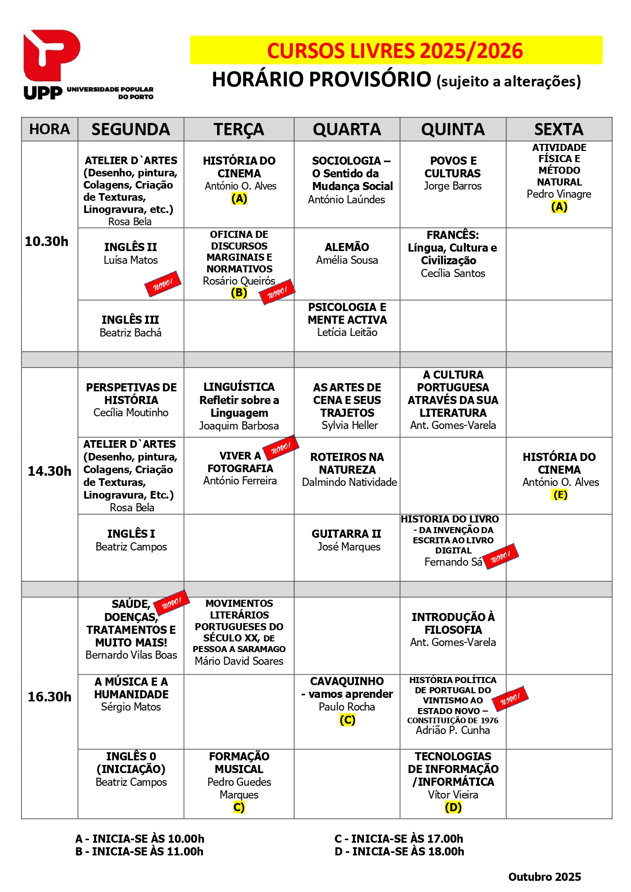 Horários dos Cursos Livres 2025/2026