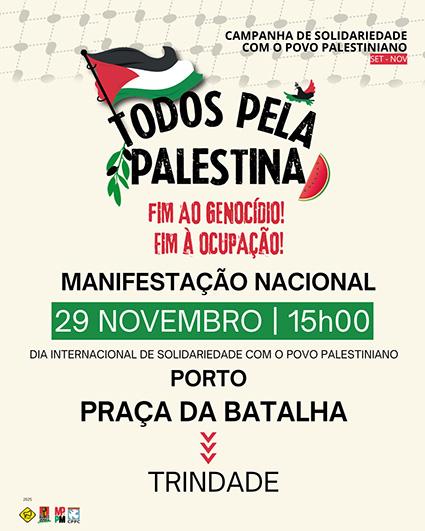 Inserida na campanha de solidariedade com o povo da Palestina, realiza-se no sábado dia 29 de Novembro uma manifestação nacional sob lema de TODOS PELA PALESTINA, FIM AO GENOCÍDIO! FIM À OCUPAÇÃO!, por convocação da CGTP-IN, CPPC, MPPM e Projeto Ruído.
