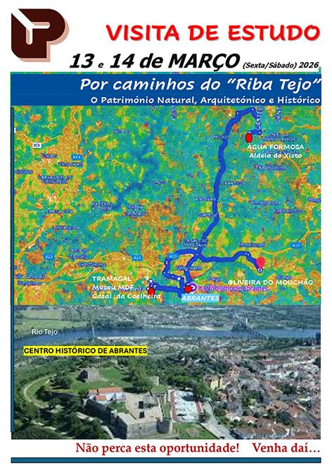 A UPP - Universidade Popular do Porto realiza nos próximos dias 13 e 14 de Março de 2026 (sexta e sábado) uma Visita de Estudo "por Caminhos do “Riba...Tejo”, no coração de Portugal, onde o Rio Tejo une o Norte e o Sul e onde, com a beleza das paisagens e a deliciosa gastronomia, se caminha pela descoberta do rico Património Natural, Arquitetónico e Histórico e das tradições do Ribatejo.