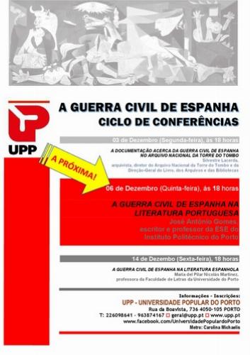 Integrada no ciclo de conferências sobre a Guerra Civil de Espanha que a UPP vem promovendo, realiza-se na quinta-feira, 6 de Dezembro, às 18H00, a Conferência A GUERRA CIVIL DE ESPANHA NA LITERATURA PORTUGUESA, por José António Gomes, escritor e professor do Instituto Politécnico do Porto.