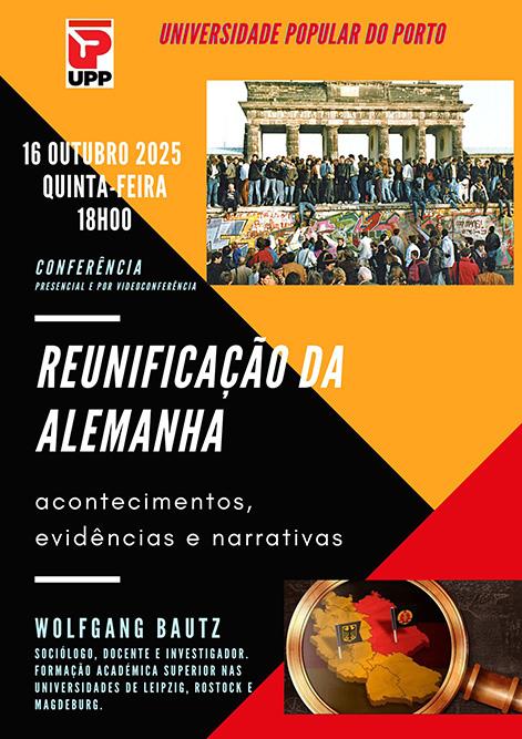 A UPP - Universidade Popular do Porto promove no dia 16 de Outubro, quinta-feira, às 18H00, uma conferência sobre a "Reunificação da Alemanha - Acontecimentos, Evidências e Narrativas" com Wolfgang Bautz, investigador, docente e sociólogo alemão.