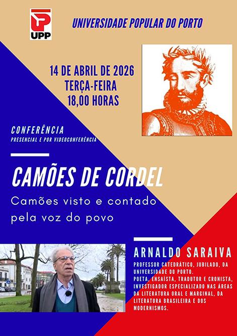 No âmbito das comemorações dos 500 anos do nascimento de Luís de Camões, a UPP - Universidade Popular do Porto promove no dia 14 de Abril, terça-feira, às 18H00, uma Conferência do Professor Arnaldo Saraiva sobre "CAMÕES DE CORDEL - Camoes visto e contado pelo povo".
