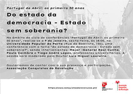 Numa iniciativa da Associação Conquistas da Revolução, com apoio da UPP - Universidade Popular do Porto, realiza-se no dia 9 de Janeiro de 2026, sexta-feira, às 18h00, uma conferência sobre o tema "Do estado da democracia - Estado sem soberania?".