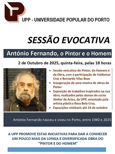 A UPP - Universidade Popular do Porto realiza no dia 2 de Outubro de 2025, quinta-feira, pelas 18 horas uma Sessão Evocativa de António Fernando, do Pintor, do Homem e da Obra, com a apresentação de Valdemar Cruz e Bernardo Vilas Boas.