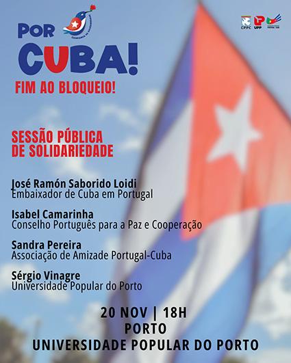 Inserida na campanha de solidariedade com Cuba pelo "fim ao bloqueio", realiza-se no dia 20 de novembro, quinta feira, às 18h00, na UPP, uma Sessão Pública de Solidariedade com Cuba promovida pela UPP- Universidade Popular do Porto, Conselho Português para a Paz e Cooperação e Associação de Amizade Portugal-Cuba.