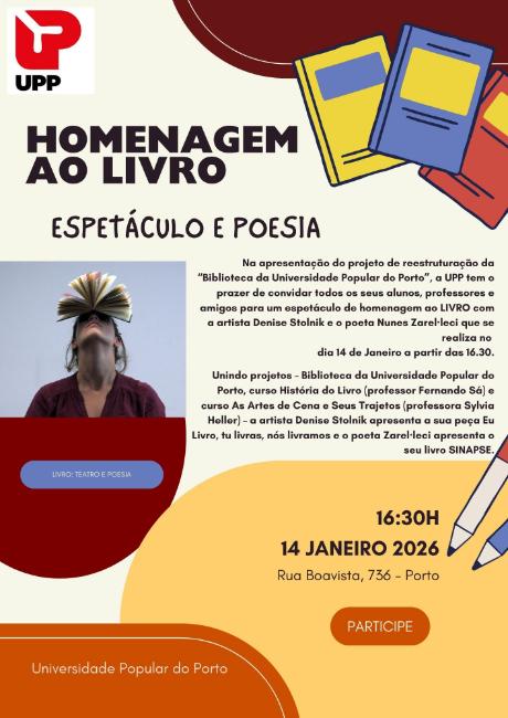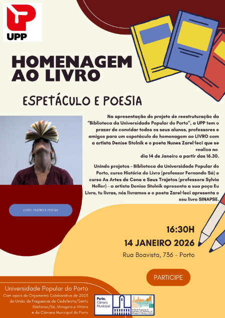 Na apresentação do projeto de reestruturação da “Biblioteca da Universidade Popular do Porto”, a UPP tem o prazer de convidar todos os seus alunos, professores e amigos para um espetáculo de homenagem ao LIVRO com a artista Denise Stolnik e o poeta Nunes Zarel·leci que se realiza no dia 14 de Janeiro de 2026, a partir das 16.30, na sede da UPP na Rua da Boavista, 736 - Porto.