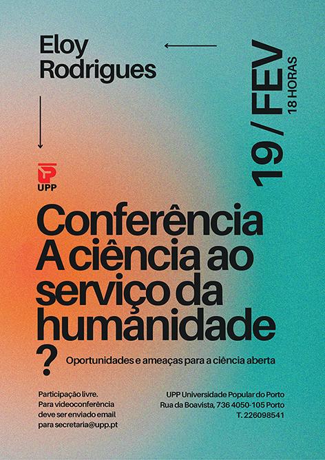 A UPP -Universidade Popular do Porto tem o prazer de anunciar a realização no dia 18 de Fevereiro, quinta-feira, às 18h00, da Conferência "A ciência ao serviço da humanidade? Oportunidades e ameaças para a ciência aberta", com Eloy Rodrigues na Rua da Boavista, 736 - Porto.